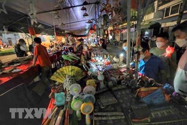 Chợ đêm trên phố Hàng Dầu tắt điện và sử dụng ánh sáng của điện thoại. (Ảnh: Tuấn Đức/TTXVN)