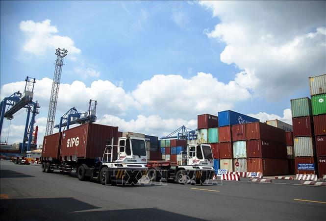 Xe chở container hoạt động tại Cảng Cát Lái (Tân Cảng Sài Gòn), thành phố Thủ Đức, TP Hồ Chí Minh