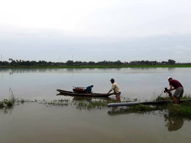 Một số khu vực ngập sâu, người dân phải dùng thuyền vận chuyển máy bơm tiêu úng