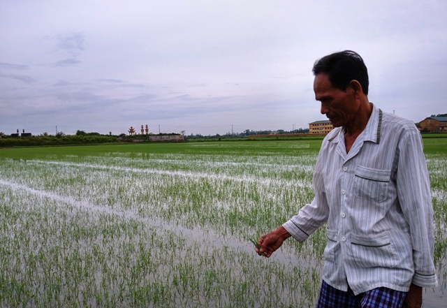 Nông dân Quảng An ra đồng kiểm tra cây lúa bị ngập úng