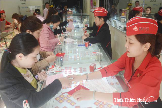 8 giờ sáng, cửa hàng trưng bày, bán sản phẩm chế tác từ vàng của Chi nhánh Tập đoàn Vàng bạc đá quý Doji tại Huế ở đường Trần Hưng Đạo kín chỗ để xe. Bên trong khu vực bán hàng, hàng chục khách hàng đứng kín các tủ kính trưng bày sản phẩm để xem, lựa chọn. Càng trưa, lượng khách đến mua vàng càng tăng, chi nhánh phải huy động toàn bộ nhân viên để viết phiếu, ghi thông tin cho khách hàng mua vàng.