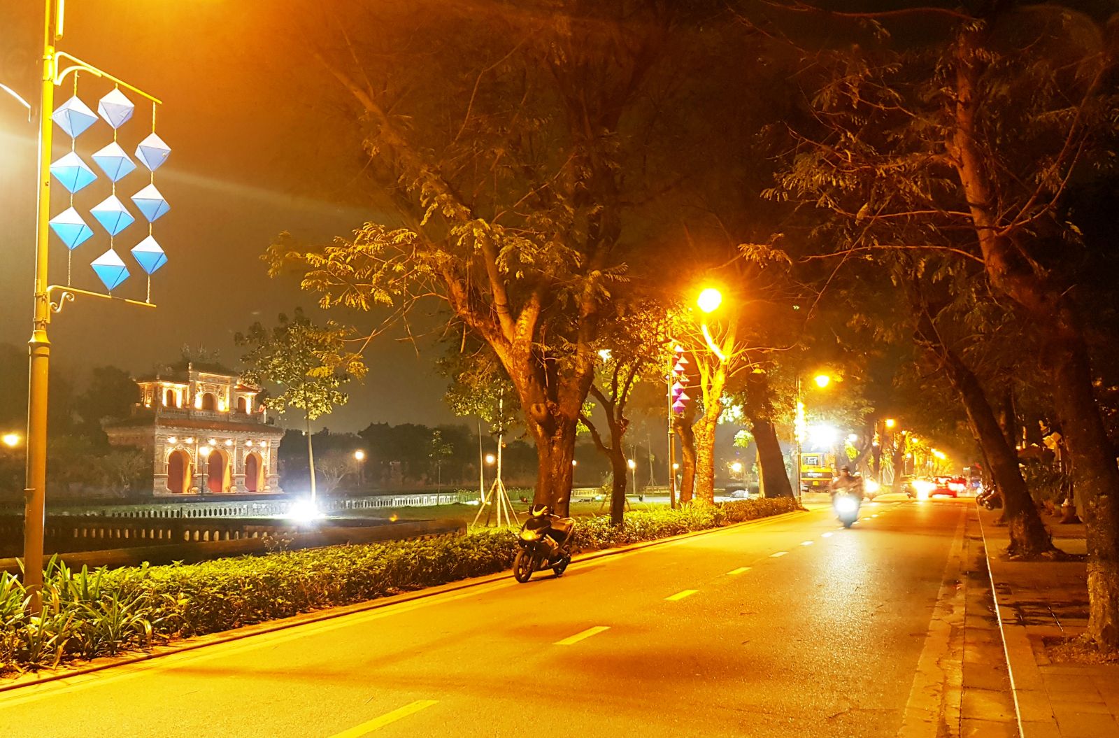 Trang trí đèn lồng, hệ thống chiếu sáng phục vụ phố đêm trên đường Lê Huân đã hoàn tất. Ảnh: A.T