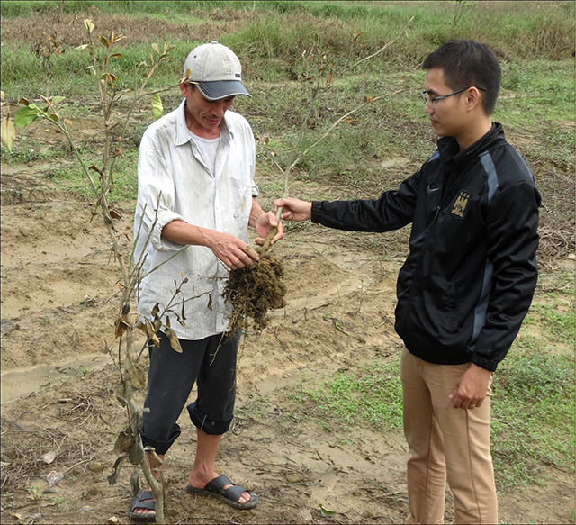 Ông Trần Quốc Phong, thôn Vân Trạch Hòa tiếc nuối khi cây thanh trà 1 năm tuổi của gia đình ông bị chết do lũ