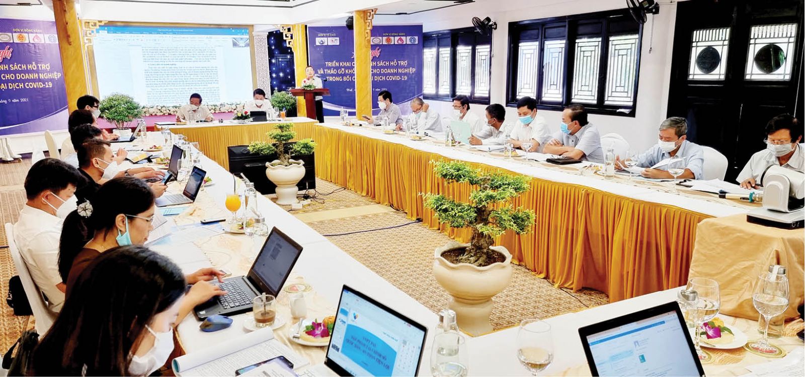 Tại hội nghị, đại diện các Ngân hàng (NH) Nhà nước, NH Chính sách xã hội, Cục Thuế, Bảo hiểm xã hội, Sở Lao động - Thương binh và Xã hội trình bày một số chính sách (CS) của ngành NH hỗ trợ DN và người dân; hướng dẫn người sử dụng lao động vay để trả lương ngừng việc, trả lương phục hồi sản xuất theo Quyết định 23 của Thủ tướng Chính phủ; các CS thuế hỗ trợ DN; CS giảm mức đóng bảo hiểm cho các đối tượng; CS hỗ trợ đào tạo và duy trì việc làm cho người lao động và Sản phẩm tài chính số quốc dân của VNPT.