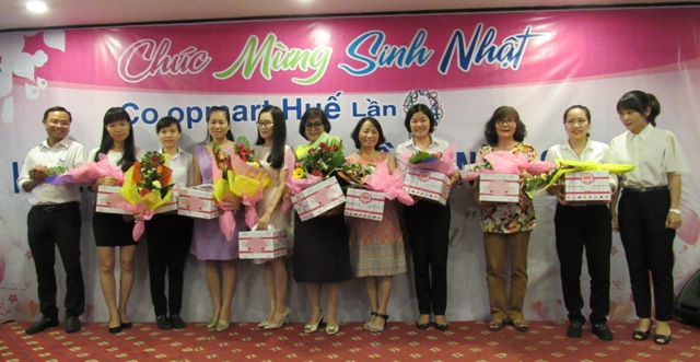 Từ 3/5 đến 24/5, Co.opmart Huế thực hiện nhiều chương trình khuyến mãi hấp dẫn nhằm tri ân đến khách hàng đã đồng hành và ủng hộ siêu thị trong suốt 9 năm qua. Trong đó có các chương trình như: “Giá đặc biệt mừng sinh nhật” với hình thức giảm giá 900 mặt hàng với mức giảm đến 49% và được mua hàng giá siêu ưu đãi với các mức từ 2.000 đồng/sản phẩm khi mua hóa đơn từ 400 nghìn đồng; “Ngày vàng ngập tràn quà tặng”; tri ân khách hàng với các hình thức bảo hành điện gia dụng miễn phí, miễn vé trong khu vui chơi, tặng vé xe buýt cho khách hàng vùng huyện, tặng bánh kem. Tại hội nghị khách hàng này, Co.opmart đã trao 12 phần quà trúng thưởng cho 12 KH may mắn tham gia chương trình “Sinh nhật vàng rộn ràng trúng thưởng” kéo dài từ ngày 3 đến 23/5 với tổng trị giá 43,19 triệu đồng.