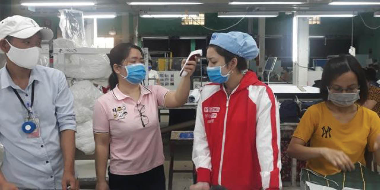 Đo thân nhiệt cho công nhân trước khi vào làm việc
