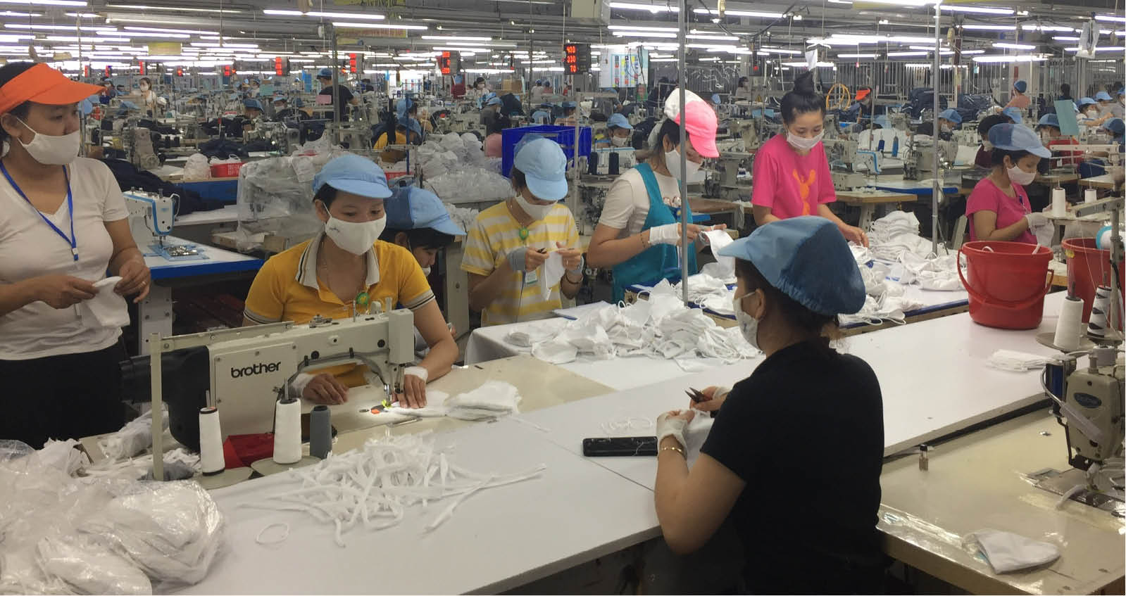Để đảm bảo Bộ tiêu chí đánh giá mức độ an toàn trong phòng, chống dịch tại nhà máy, cơ sở sản xuất công nghiệp, tại khu vực nhà ăn cũng được thực hiện đúng theo quy định, công nhân được giãn cách khi ăn trưa, mỗi bàn bố trí 2 người, ngồi đối lưng, thức ăn cũng được đựng trong sản phẩm sử dụng một lần để tránh dịch bệnh. Tại nhà máy, công nhân lao động phải tuân thủ nghiêm túc phòng chống dịch, đeo khẩu trang, hạn chế tiếp xúc.