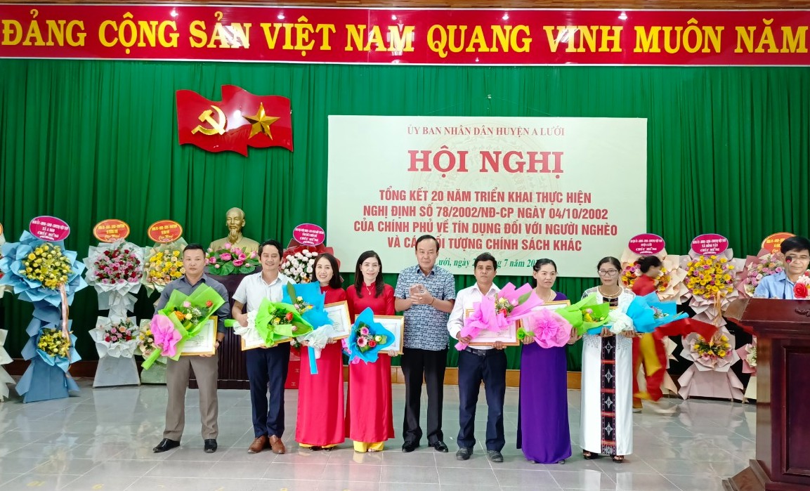 Nhân dịp này, Tổng Giám đốc NHCSXH tặng giấy khen cho 2 tập thể, 7 cá nhân; Chủ tịch UBND huyện A Lưới tặng giấy khen cho 7 tập thể, 10 cá nhân có thành tích xuất sắc trong 20 năm thực hiện và phối hợp triển khai chính sách tín dụng đối với người nghèo và các đối tượng chính sách khác theo Nghị định 78/2002/NĐ-CP của Chính phủ trên địa bàn huyện.