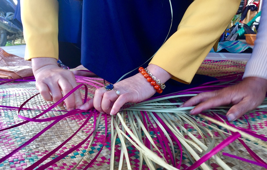 Trình diễn đan chiếu. Theo đồng bào nơi đây, sợi chiếu được tước từ vỏ cây rừng, qua nhiều công đoạn xử lý, nhuộm màu, phơi khô... rất công phu mới có thể đan thành tấm chiếu nhiều màu sắc