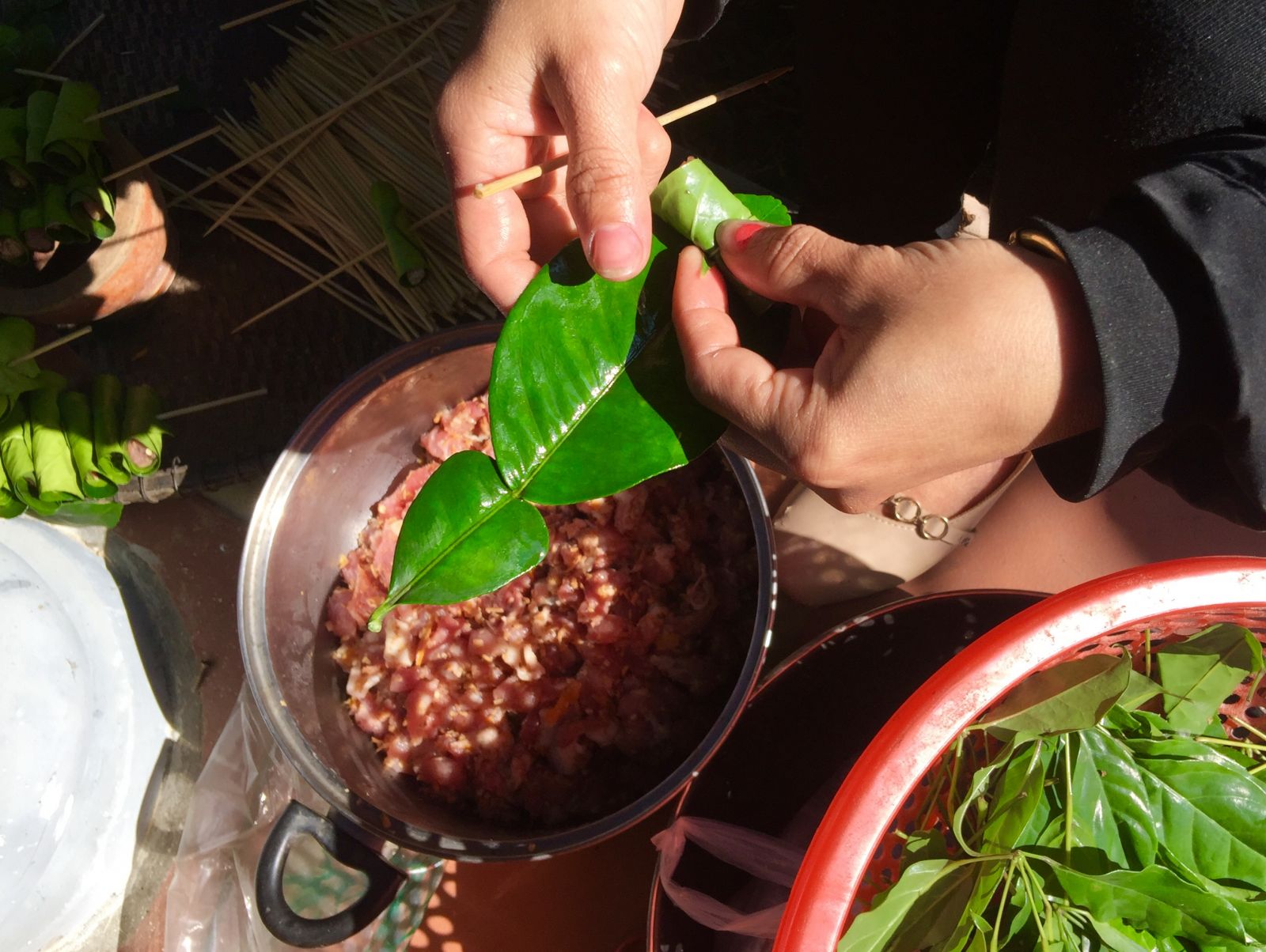 Thịt nướng được gói bằng một lớp lá rừng và một lớp lá bưởi đem lại hương vị thơm ngon đặc trưng