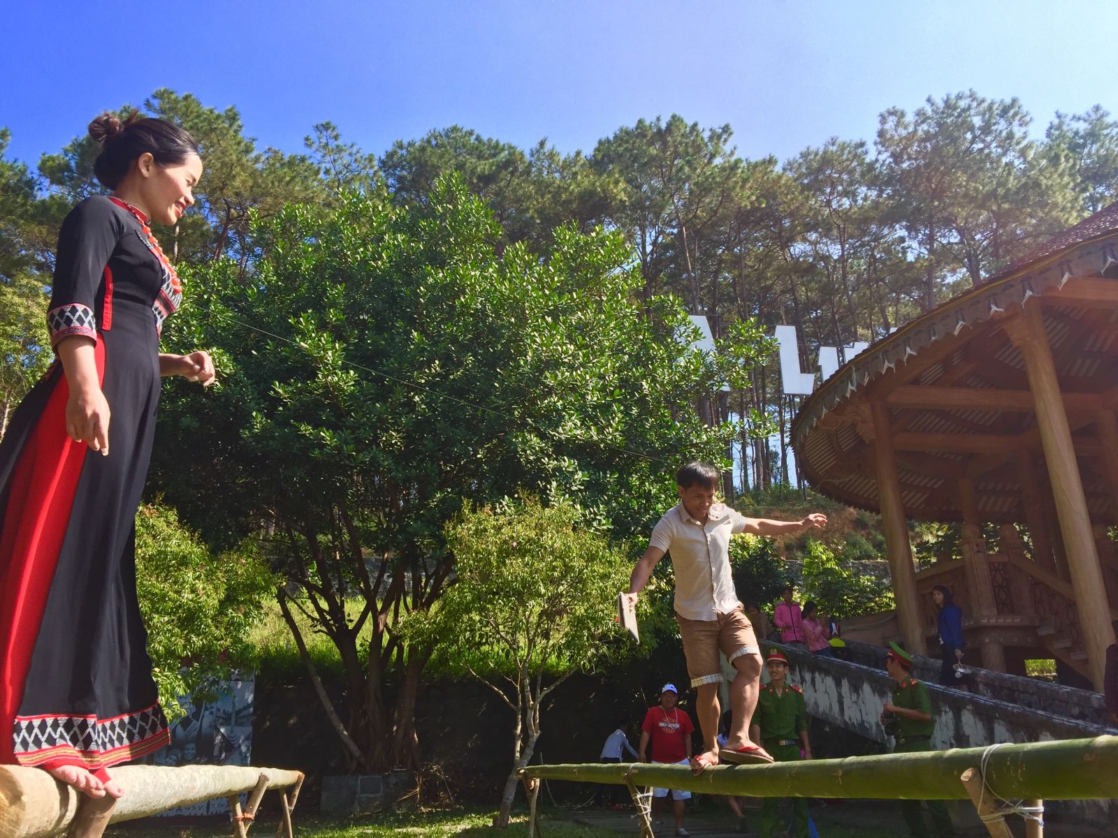 ... qua cầu độc mộc khiến phiên chợ càng thêm rộn rã.