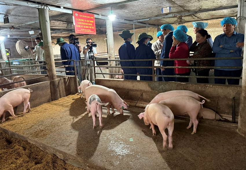 | Tham quan quy trình chăn nuôi lợn an toàn sinh học, hữu cơ, tuần hoàn theo chuỗi của tập đoàn Quế Lâm. Ảnh: Bá Trí |