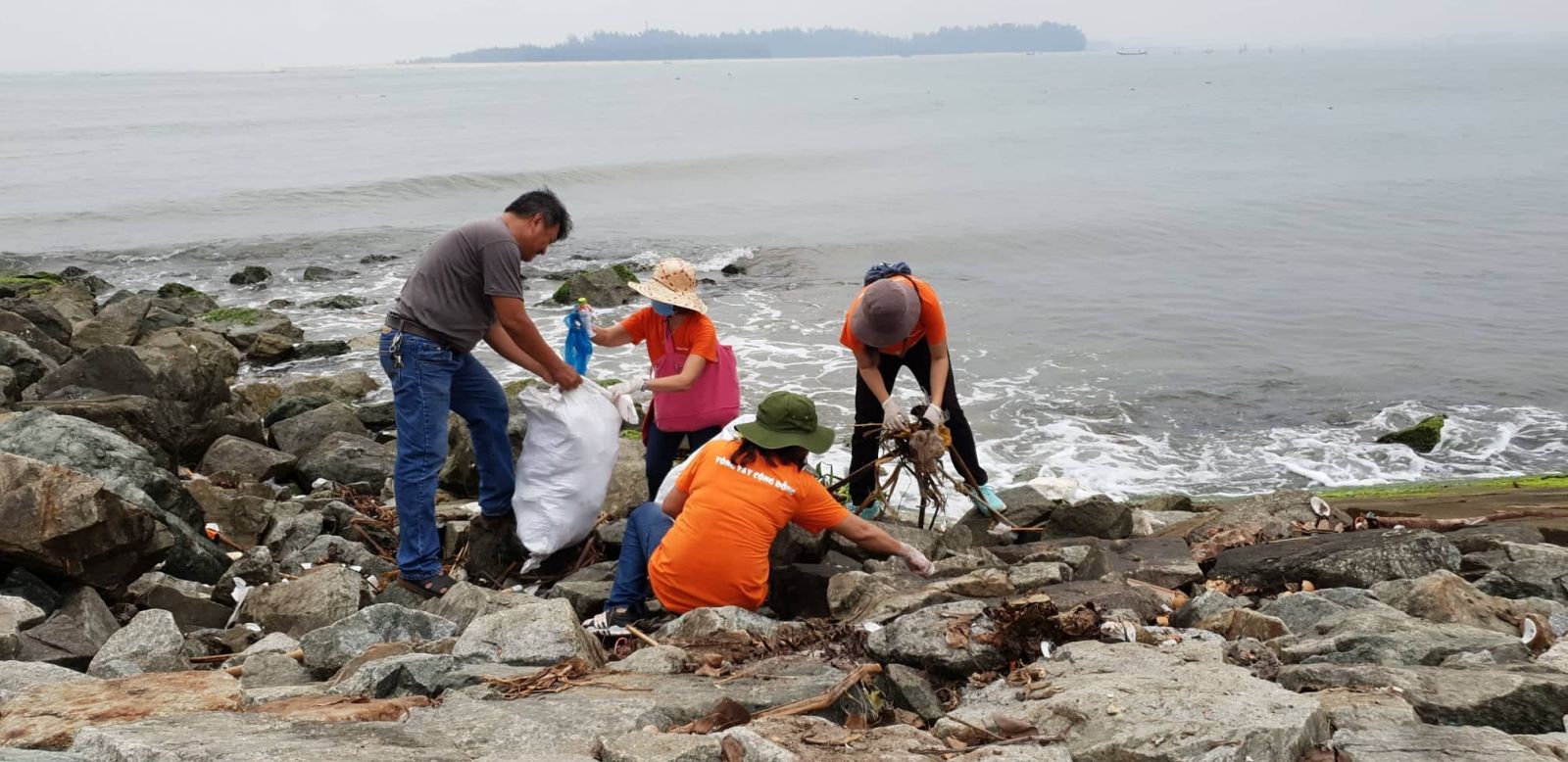 Các tổ chức, cá nhân tham gia nhặt rác ở khu vực bờ kè biển Hải Dương