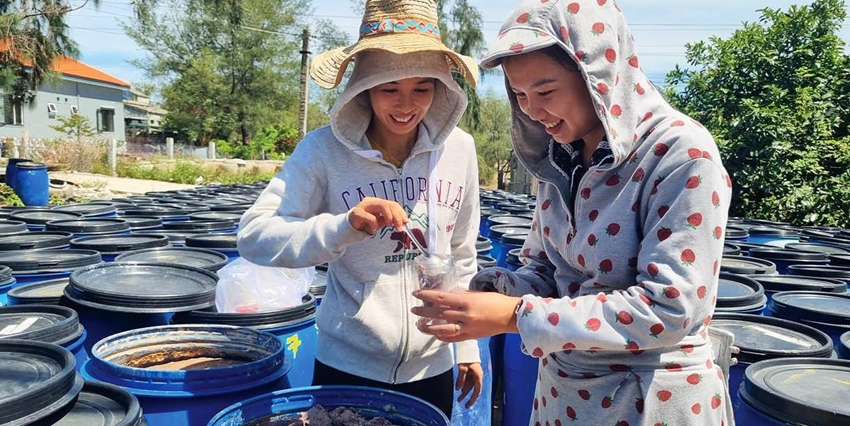| Chị Hảo (trái) và chị Linh kiểm tra “độ chín” của mẻ ruốc năm nay |