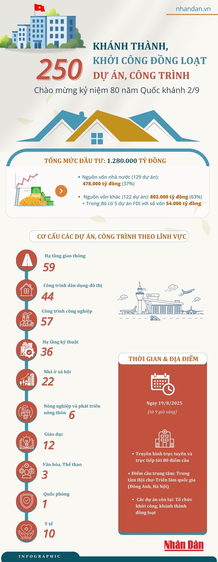 Chào mừng kỷ niệm 80 năm Quốc khánh nước Cộng hòa xã hội chủ nghĩa Việt Nam (2/9/1945-2/9/2025), Lễ khánh thành, khởi công đồng loạt các công trình, dự án lớn trên cả nước được tổ chức vào ngày 19/8/2025, truyền hình trực tiếp kết hợp trực tuyến đến các công trình, dự án.