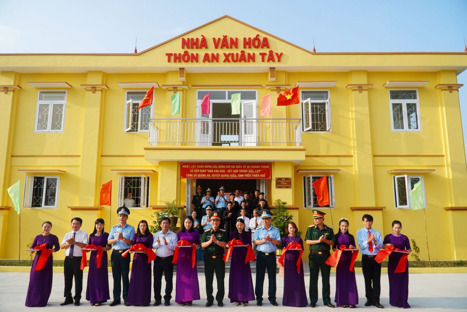 Lãnh đạo Bộ Quốc phòng, Quân chủng Phòng không- không quân và lãnh đạo tỉnh, huyện, xã tiến hành nghi lễ cắt băng khánh thành Nhà văn hóa thôn An Xuân Tây