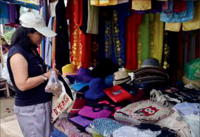 Du khách chọn mua quà lưu niệm khi tham quan Huế. Ảnh: Đức Quang