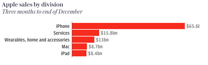 Mảng dịch vụ tiếp tục mang về doanh thu lớn cho Apple, với 15,8 tỷ USD. Tiếp đến là mảng thiết bị đeo, thiết bị gia đình và phụ kiện với 13 tỷ USD. Riêng Apple Watch và tai nghe AirPods tăng 30%.