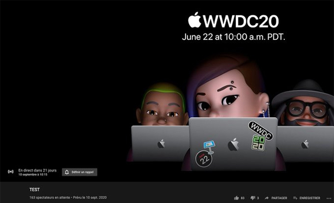 Theo 9to5mac, một số người phát hiện Apple thử lên lịch một sự kiện trực tiếp vào đầu tháng 9 tới. "Nội dung xuất hiện trên trang thông báo về các kênh Youtube được theo dõi của tôi và bị xóa ít phút sau đó", tài khoản WeiRdCroissant.HODL đăng trên Twitter. Hình ảnh đi kèm cho thấy tài khoản Apple đăng sự kiện có tên TEST cùng ảnh mô tả cũ của WWDC20 và hẹn giờ bắt đầu là ngày 10/9.
