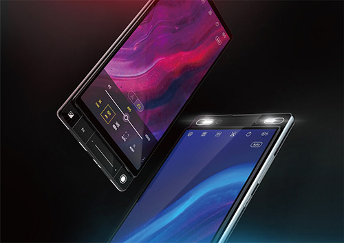 Một thiết bị khác của Asus cũng có cơ chế trượt hai đầu với phần trên là camera selfie kép. Cạnh dưới là một màn hình phụ, sẽ hiển thị các chức năng tương ứng với ứng dụng đang chạy trên màn hình chính. Hình ảnh render xuất hiện với tính năng camera thì màn hình phụ có các nút điều chỉnh EV, phím chụp. Thiết bị này tích hợp máy quét vân tay ở mặt sau máy.