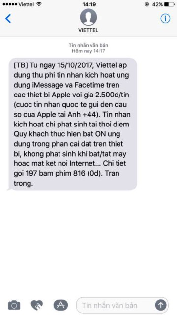 Cụ thể, nhà mạng Viettel gửi tin nhắn đến khách hàng có nội dung: “Từ ngày 15/10/2017, Viettel áp dụng thu phí tin nhắn kích hoạt ứng dụng iMessage và facetime trên các thiết bị Apple với giá 2.500 đồng/tin. Thông báo cũng giải thích rõ, cước tin nhắn quốc tế gửi đến đầu số của Apple tại Anh +44. Tức là cước nhắn tin đi quốc tế. Tin nhắn kích hoạt chỉ phát sinh tại thời điểm khách hàng thực hiện bật "on" ứng dụng trong phần cài đặt trên thiết bị, không phát sinh khi bật/tắt máy hoặc mất kết nối internet”.