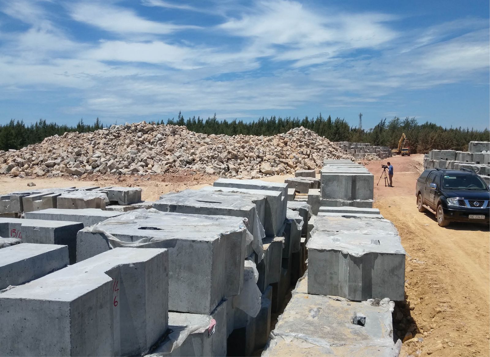Khối lượng chính đã thi công (hợp phần trên bờ) đến nay gồm đổ bê tông được 1.862/2.248 khối các cấu kiện; 610/1.325 khối haro 5,9 tấn; 24/102 khối tetrapod 8,5 tấn; giá trị thực hiện đến nay khoảng 13 tỷ đồng/33,6 tỷ đồng tổng giá trị hợp đồng.