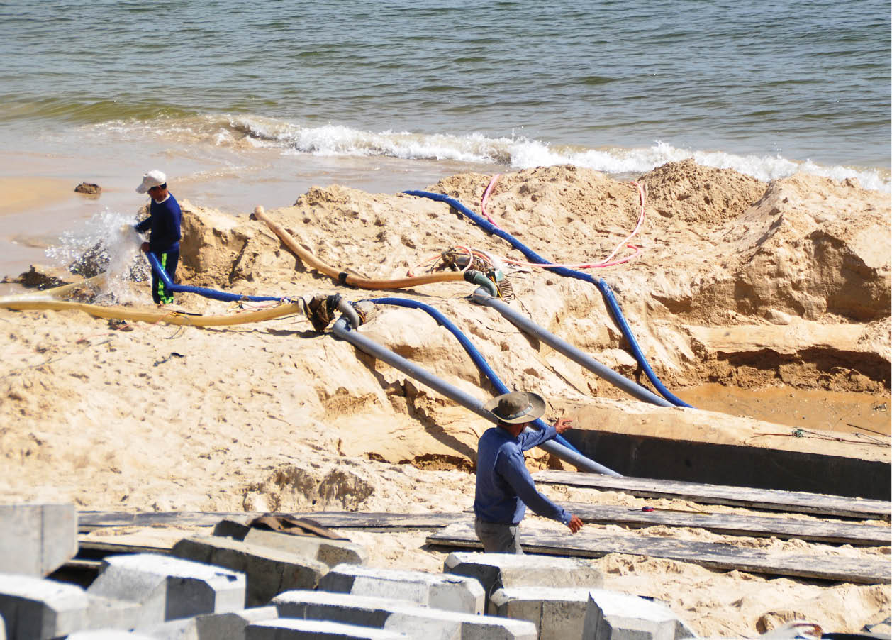 Hạng mục chính thi công tiếp theo (phần ngoài biển) gồm nạo vét móng kè, thi công đá học móng kè, lắp đặt bê tông khối phủ hoàn thiện kè. Để thi công hợp phần ngoài biển, chủ đầu tư đã huy động 2 xà lan 800 tấn, cần cẩu 50 tấn và thiết bị hút móng kè.
