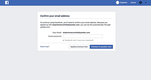 Facebook đã yêu cầu một số người dùng mới cung cấp mật khẩu truy cập vào tài khoản email của họ. Cụ thể, khi người dùng cố gắng đăng ký tài khoản Facebook với một số nhà cung cấp email nhất định, bao gồm Yandex và GMX, họ được yêu cầu "xác nhận địa chỉ email" bằng cách nhập trực tiếp mật khẩu vào Facebook.
