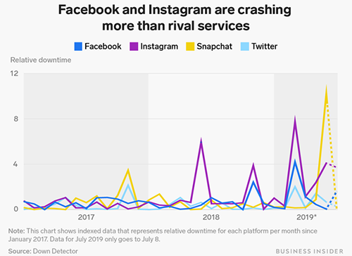 DownDetector không công bố số giờ "sập mạng" của Facebook và Instagram nhưng có tung ra biểu đồ so sánh với các nền tảng mạng xã hội khác. Nhìn chung, dịch vụ cùng thuộc sở hữu của công ty Facebook kém ổn định hơn so với Snapchat hay Twitter.
