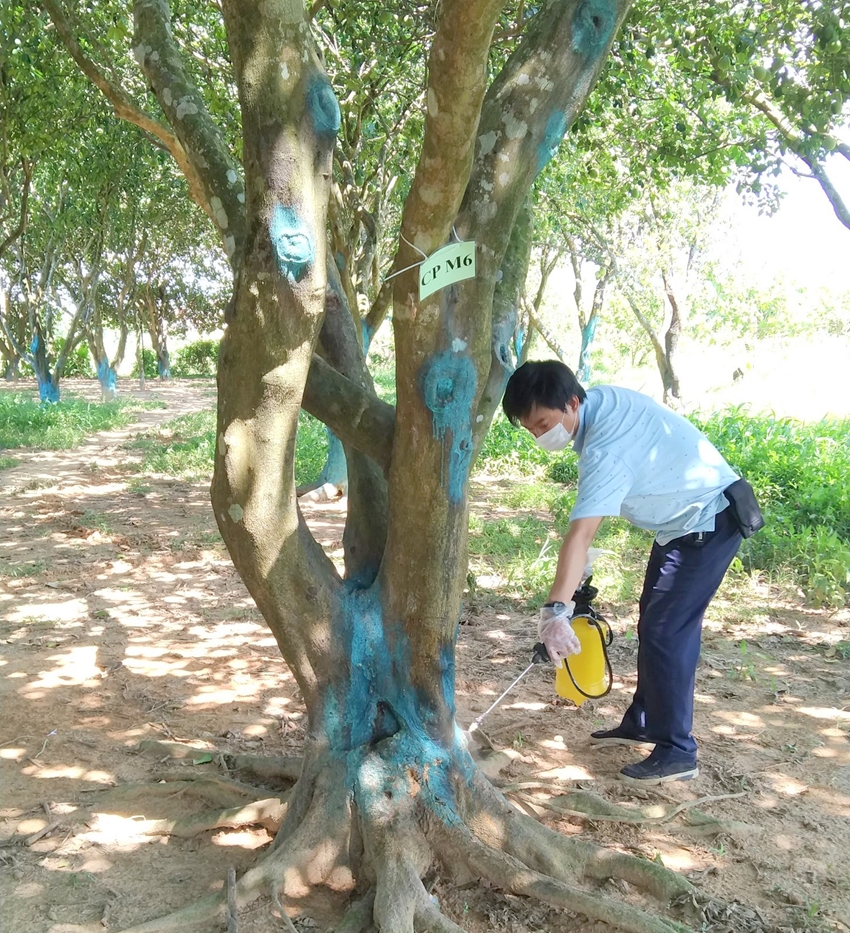 Thực hiện nội dung nghiên cứu thử nghiệm mô hình phòng bệnh trong đề tài nhánh “Nghiên cứu và phát triển chế phẩm vi sinh phòng chống nấm bệnh Phytophthora spp. trên bưởi thanh trà, sau những đợt xử lý đầu tiên bệnh chảy gôm trên cây có múi ở mô hình đánh giá hiệu quả của chế phẩm tại vườn thanh trà tại phường Hương Vân, thị xã Hương Trà, nhóm nghiên cứu của Viện CNSH, ĐH Huế đã ghi nhận nhiều dấu hiệu khả quan trong việc phòng trừ bệnh.