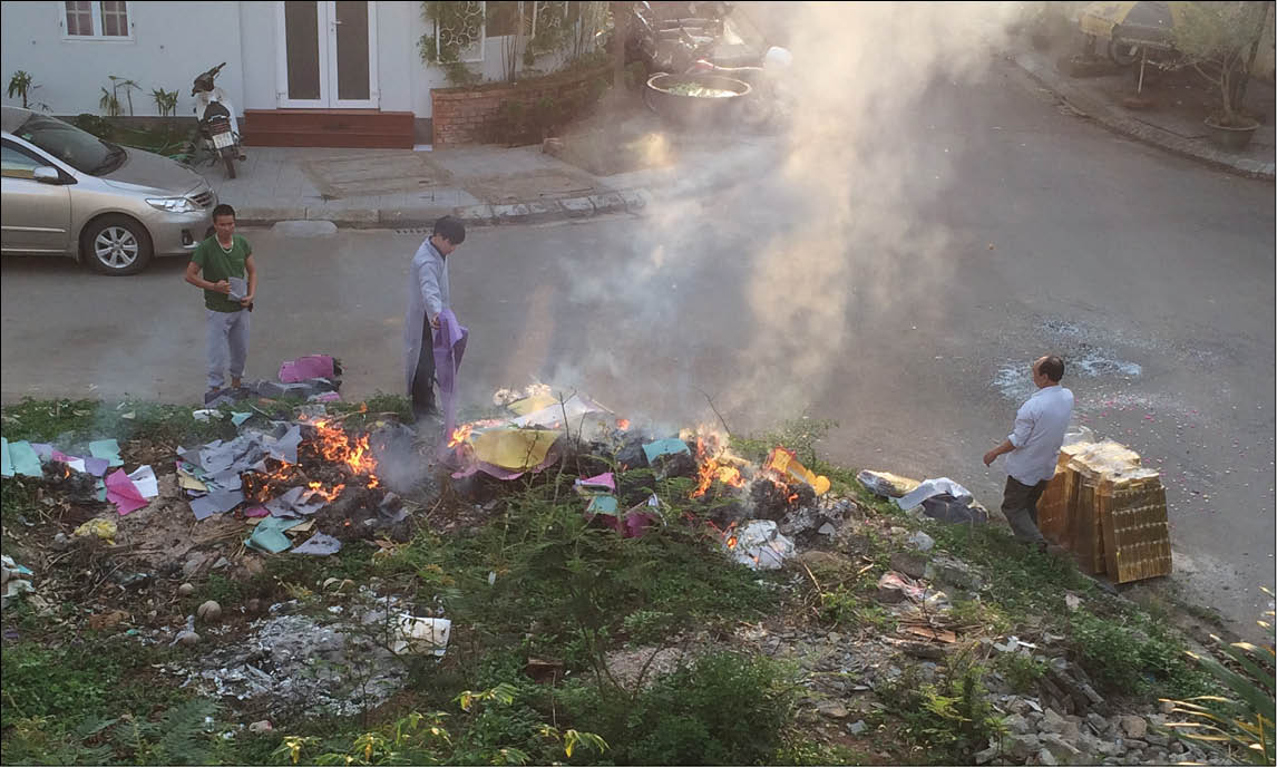 Tình trạng đốt vàng mã không đúng nơi quy định, không che chắn và đốt với số lượng lớn vẫn xảy ra ở nhiều nơi trên địa bàn TP. Huế (Trong ảnh: Một gia đình đốt giấy vàng mã sau lễ cúng tại khu dân cư ở phường Thủy Xuân)