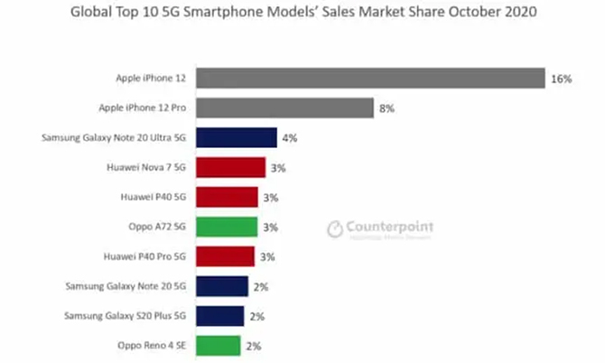 Bộ đôi iPhone mới của Apple chiếm 24% tổng doanh số điện thoại 5G bán ra toàn cầu trong tháng 10/2020 theo số liệu của Counterpoint Research. Các model đứng sau với khoảng cách khá xa là Note20 Ultra (chiếm 4%), Huawei Nova 7 5G (3%), P40 Pro 5G (3%)...
