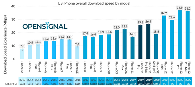 Theo Ian Fogg, người đứng đầu nhóm phân tích của OpenSignal, việc này có liên quan tới thiết kế băng tần RF vì ngoài modem, các thành phần khác nhau trong điện thoại cũng có thể tác động tới tốc độ kết nối 4G/5G. iPhone 12 là thiết bị 5G đầu tiên của Apple, trong khi các nhà sản xuất Android đã đi trước và cho ra đời nhiều mẫu 5G khác nhau. Chẳng hạn Galaxy S21 là thế hệ điện thoại thông minh 5G thứ ba của Samsung.