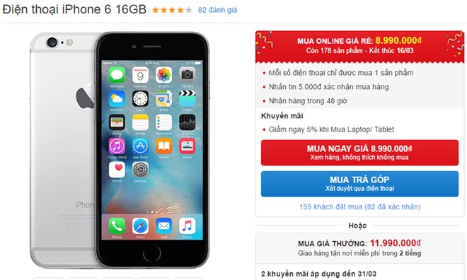 Sau thời gian ngắn được bán với giá bất hợp lý, iPhone 6 16 GB vừa trở về giá trị thực của mình. Giá niêm yết của sản phẩm được giảm từ mức 11,99 triệu đồng (ngang với iPhone 6 Plus 16 GB) về 8,99 triệu đồng.