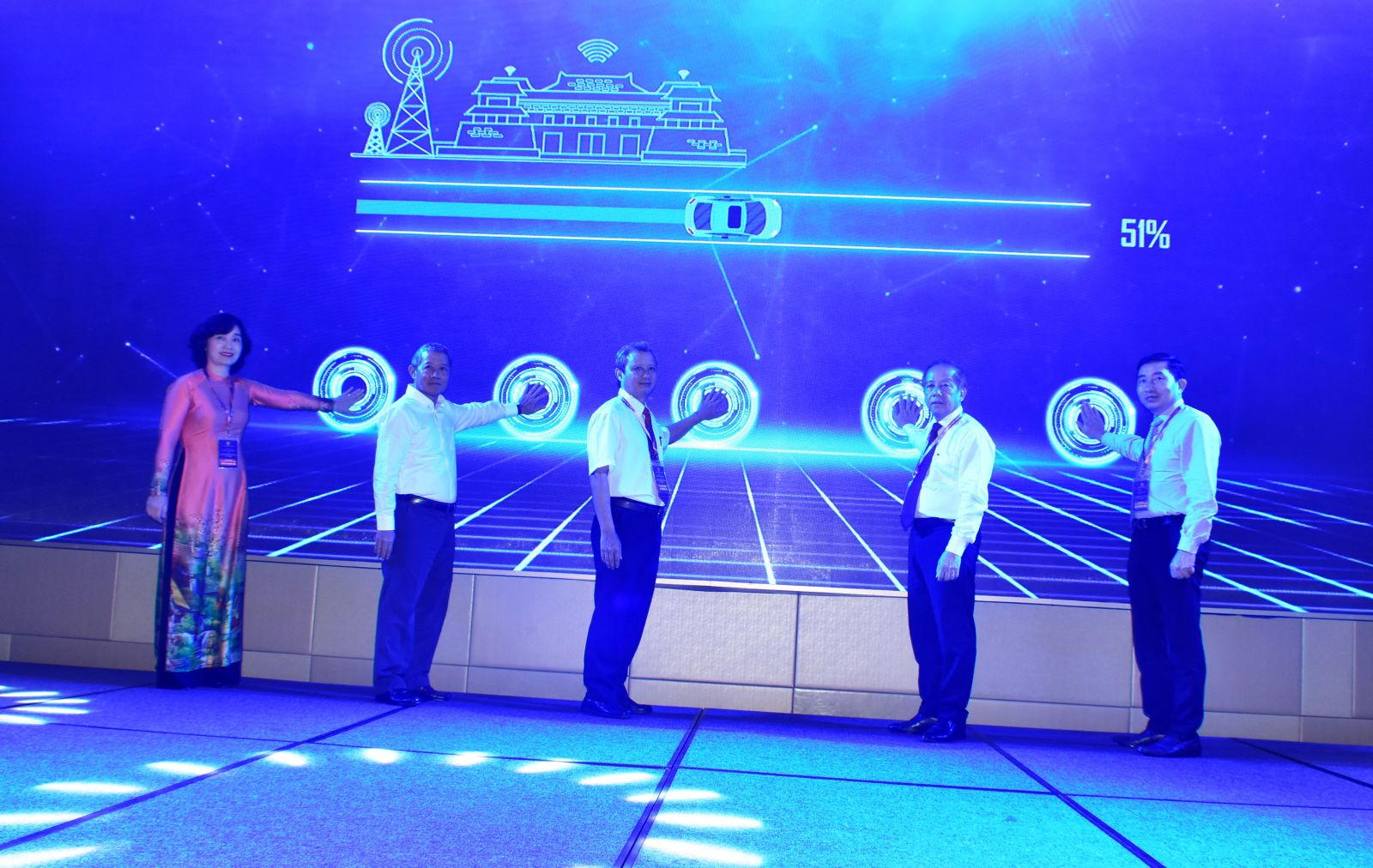 Lãnh đạo các bộ, ngành cùng lãnh đạo tỉnh với nghi thức công bố dịch vụ Trung tâm Giám sát điều hành đô thị thông minh