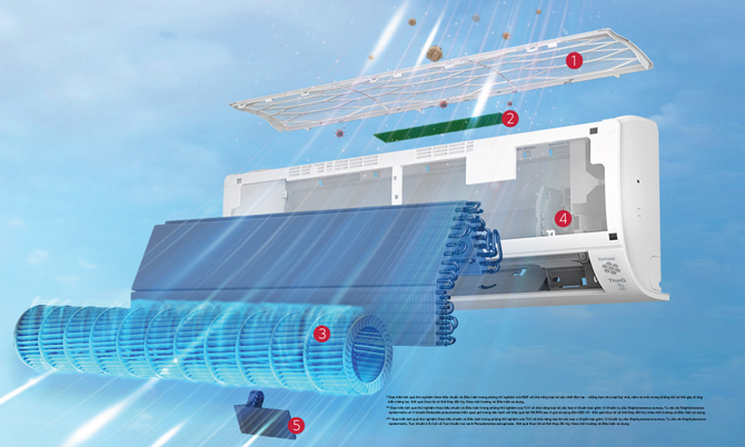LG Dualcool mới ra mắt có thêm đèn UVnano để diệt khuẩn (vị trí số 3) và bộ phát tán ion Plasmaster (số 5).