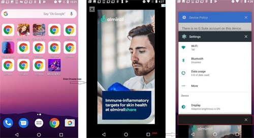 Sau khi cài đặt lên thiết bị, mã độc tự ẩn biểu tượng gốc, ngụy trang bằng biểu tượng của Chrome, thậm chí thay luôn trình duyệt Google trên màn hình chính, nhằm đánh lừa người dùng. Sau đó, chúng liên tục hiển thị quảng cáo toàn màn hình. Thậm chí, một số mã còn tạo bản sao shortcut của Chrome và hiện quảng cáo ngay khi thiết bị mở khóa. Cách duy nhất để đóng quảng cáo này là nhấn phím Home hoặc phím Back.