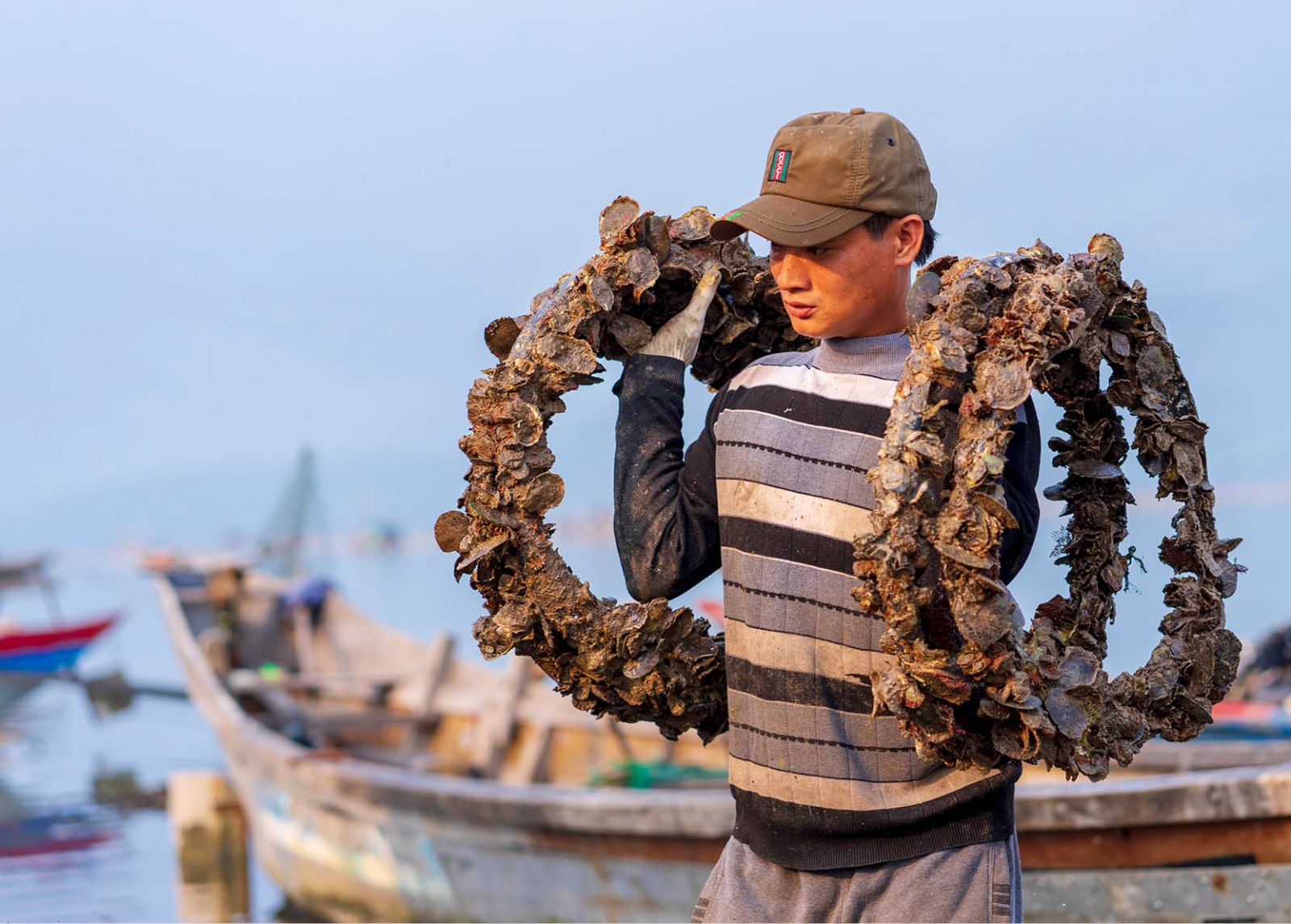 Nuôi hàu trên lốp xe ở đầm Lập An