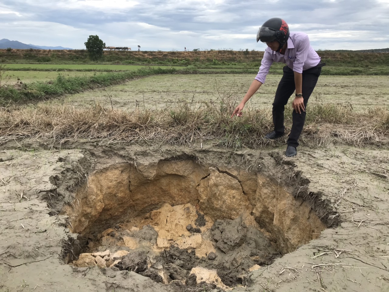 Một hố sụt lún giữa cánh đồng làm người dân hoang mang