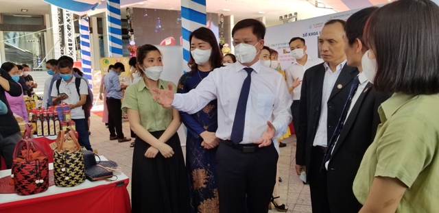 Phó Chủ tịch UBND tỉnh Nguyễn Thanh Bình (giữa) đánh giá cao các ý tưởng, đổi mới sáng tạo sản phẩm của ngành KH&CN
