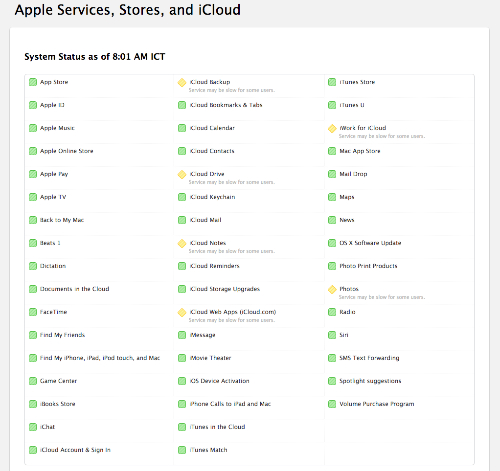 Trên trang chủ, Appe đã phải mở ra một mục riêng để cập nhật trạng thái, thông báo cho người dùng tình trạng hoạt động của các dịch vụ. Tính đến 8h sáng 3/6 (theo giờ Việt Nam), các dịch vụ iCloud Backup (sao lữu dữ liệu trực tuyến), iCloud Drive (kho lưu trữ trực tuyến), Photos (kho ảnh trực tuyến) cũng như ứng dụng Notes, iWork hoạt động trên web đều vẫn khó truy cập vì tốc độ chậm.