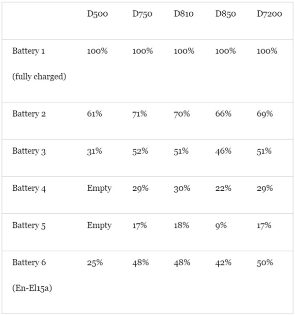 Cụ thể hơn, Martin Beran cho biết chiếc DSLR Nikon D500 mà anh sử dụng gặp rắc rối trong việc chỉ báo mức dung lượng pin còn lại. Đơn cử, chiếc Nikon D500 của anh dù báo dung lượng pin được sạc đầy ở mức 100%, nhưng mức dung lượng thật không đúng như thông tin mà chiếc DSLR này hiển thị. Nhiếp ảnh gia này đã thử nghiệm thực tế viên pin trên chiếc Nikon D500 của anh với lần lượt các mẫu DSLR khác tương thích như D7200, D750, D810 và cả chiếc D850. Có thể nhận thấy mức dung lượng pin mà chiếc Nikon D500 thể hiện càng thấp càng chênh lệch nhiều so với khi anh dùng chính thỏi pin này gắn vào những chiếc DSLR nói trên (xem bảng bên dưới).