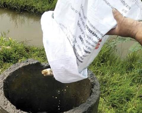 Người dân thu gom rác thải trên đồng ruộng đưa vào bể chứa