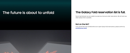 "Danh sách đặt trước Galaxy Fold đã kín. Vì nhu cầu quá lớn, chúng tôi không thể tiếp nhận thêm bất kỳ đơn hàng nào nữa. Chương trình tiếp tục sẽ được thông báo sau". Thông báo xuất hiện trang web của Samsung Mỹ chỉ vài giờ sau khi Galaxy Fold bắt đầu nhận đặt hàng tại Mỹ hôm 12/4.