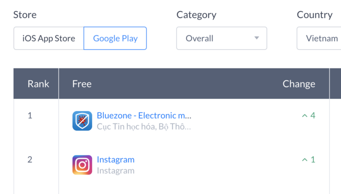 Thông kê đến ngày 30/7 của Apptopia tại Việt Nam, Bluezone là ứng dụng miễn phí có lượt tải về nhiều nhất trên kho ứng dụng iOS dành cho iPhone và iPad. Xếp ngay sau là ứng dụng khai báo y tế NCOVI.