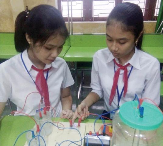 “Chúng em chia nhau mỗi người mỗi việc. Bình đựng, đèn led có thể tận dụng được bởi các dụng cụ này có sẵn trong phòng thí nghiệm. Thanh chì, kẽm có thể tận dụng được từ thỏi pin cũ và vỏ lon sữa; kiếm dụng cụ rồi hì hục lắp ráp suốt mấy ngày”, Trâm chia sẻ.