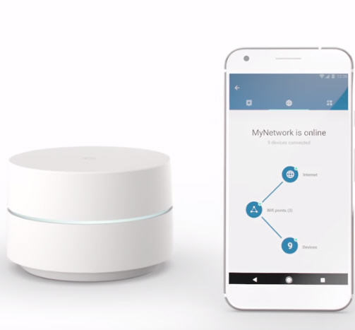 Mỗi router Google WiFi (ảnh) thông minh này có giá 139 USD, bộ ba cái là 299 USD. Google WiFi dùng chuẩn AC1200, phát sóng trên cả hai băng tần 2,4 GHz và 5 GHz, hỗ trợ công nghệ tạo chùm tia, hỗ trợ kết nối giao thức bluetooth giữa các thiết bị khác nhau. Bộ định tuyến Google WiFi có dạng hình trụ, gọn gàng, xinh xắn, giữa thân router là một dải màu xanh chứa đèn LED bên trong để cho biết tình trạng đang hoạt động. Một Google WiFi đáp ứng đủ cho căn phòng rộng 46 - 140 m2, nếu hai thiết bị tầm phủ sóng là 280 m2 và tổng bộ 3 Google WiFi đủ sức phục vụ ba khu vực tách biệt trong cùng một căn nhà rộng 420 m2.
