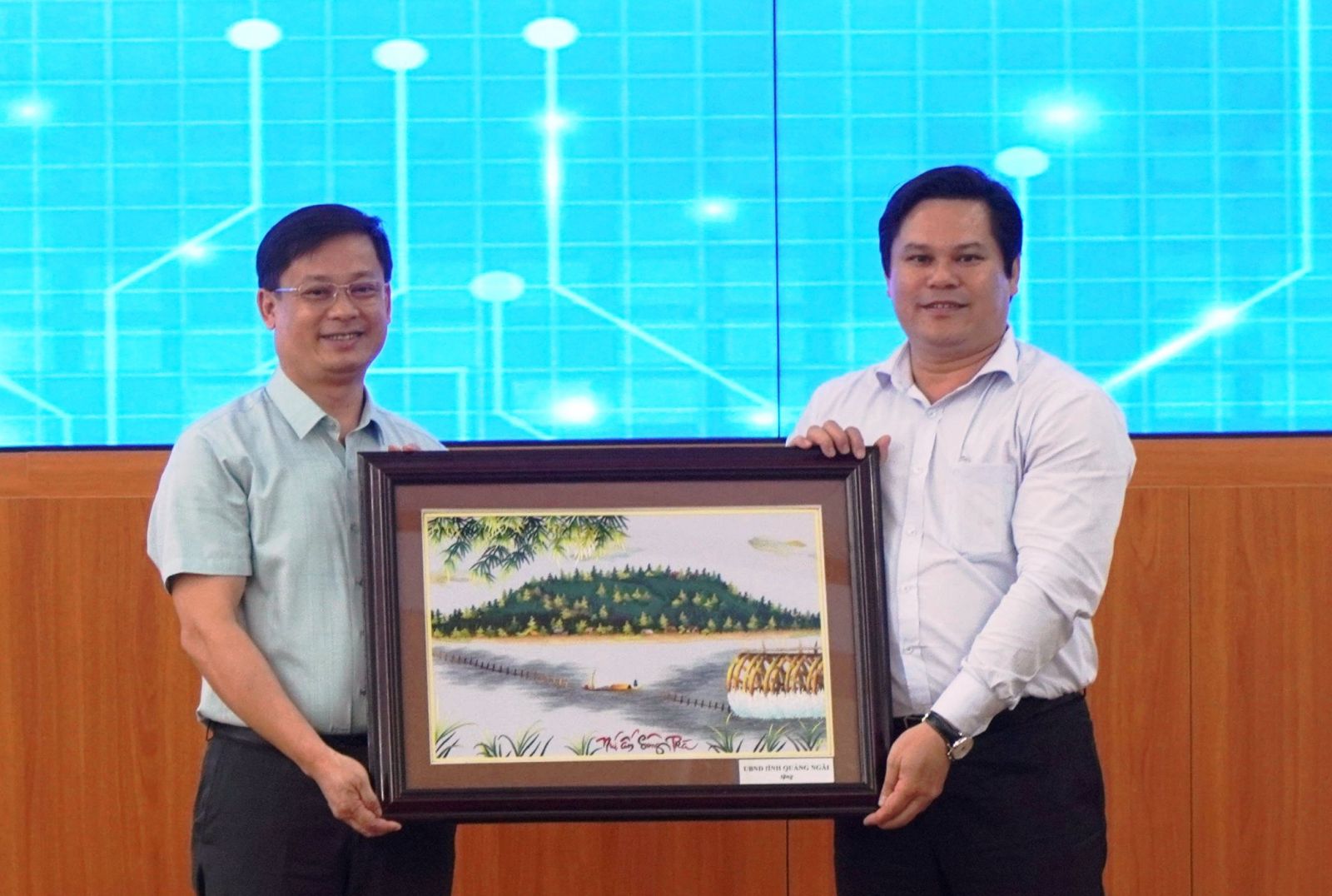 Ông Trần Phước Hiền – Phó Chủ tịch UBND tỉnh Quảng Ngãi (bên phải) tặng quà lưu niệm cho lãnh đạo tỉnh sau buổi làm việc