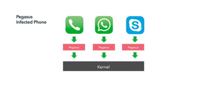 Sau khi đã "bẻ khóa" iPhone mục tiêu, Pegasus ngay lập tức lùng sục những dữ liệu bên trong thiết bị như lịch sử cuộc gọi, tin nhắn, lịch biểu, danh bạ... Nó sao chép toàn bộ, bao gồm khả năng kích hoạt camera và microphone để theo dõi trực tiếp hoạt động của nạn nhân ngay tại thời điểm đó. Ngay cả những trao đổi từ các ứng dụng tin nhắn OTT như WhatsApp, Tango, Viber, FaceTime, WeChat, Gmail, Skype, Facebook... cũng sẽ bị đánh cắp.
