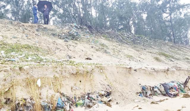 Thực tế, ngoài khu vực sạt lở làm xuất hiện “núi rác” lộ thiên đã được chôn lấp từ trước, tại vị trí này đang là điểm tập kết rác thải sinh hoạt được thu gom trước khi vận chuyển đi xử lý. Điểm tập kết này nằm ở khu vực bờ biển, thường xuyên có gió mạnh dẫn đến rác bị gió cuốn phát tán ra xung quanh và không thường xuyên được đơn vị quản lý tiến hành vệ sinh, thu dọn lượng rác phát tán, gây mất mỹ quan. Vị trí này cũng được tập kết rác thải xây dựng và rác thải cồng kềnh.